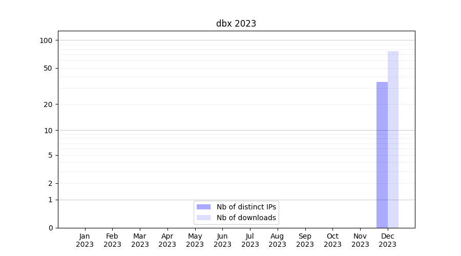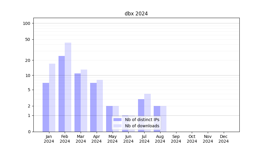 Number of downloads for experiment package dbx, year by year, from 2025 back to 2014 (years with no downloads are omitted):