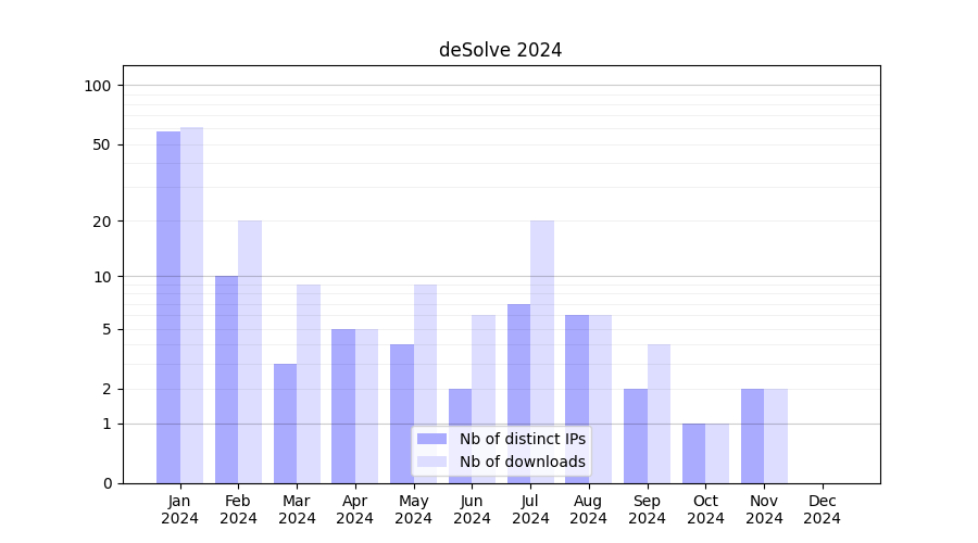 Number of downloads for experiment package deSolve, year by year, from 2025 back to 2014 (years with no downloads are omitted):