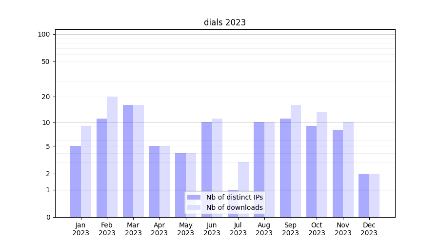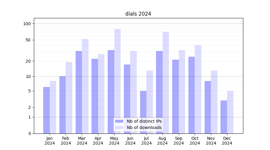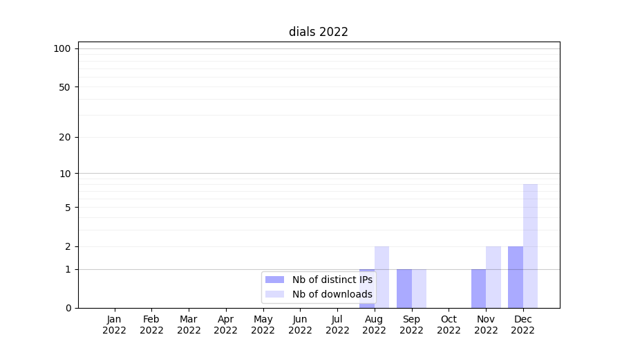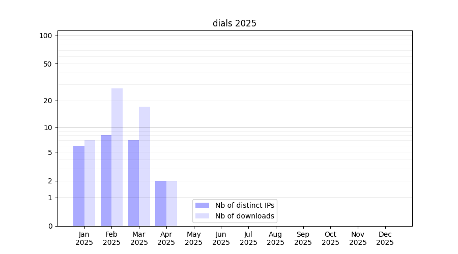 Number of downloads for experiment package dials, year by year, from 2025 back to 2014 (years with no downloads are omitted):