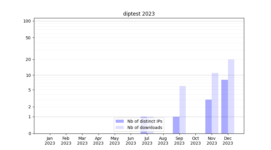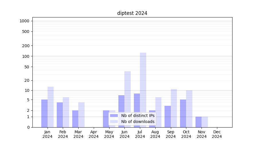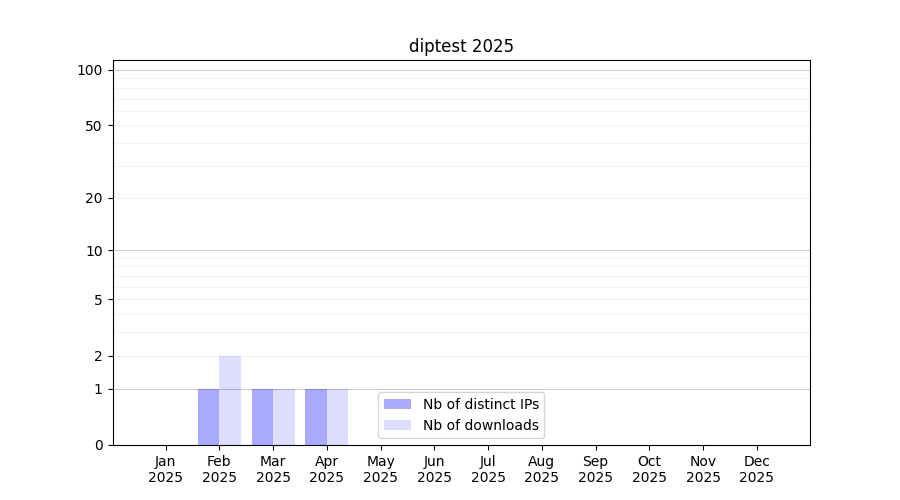 Number of downloads for experiment package diptest, year by year, from 2025 back to 2014 (years with no downloads are omitted):
