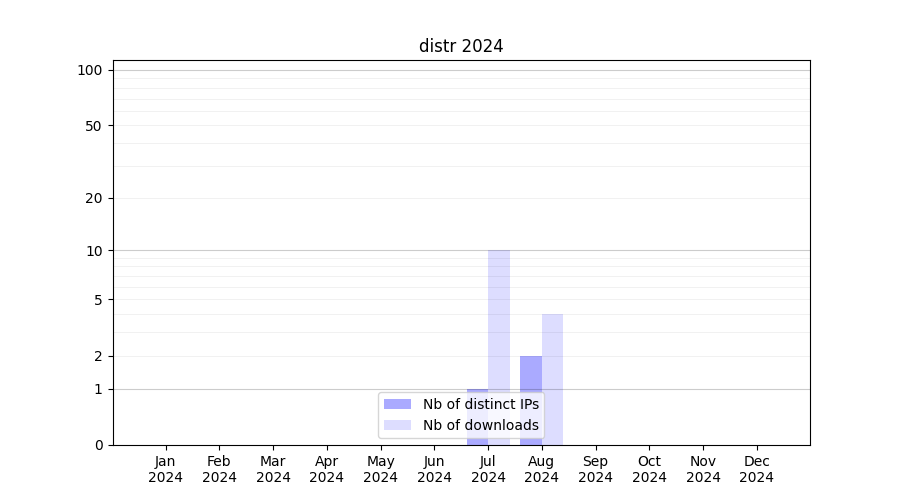 Number of downloads for experiment package distr, year by year, from 2025 back to 2014 (years with no downloads are omitted):
