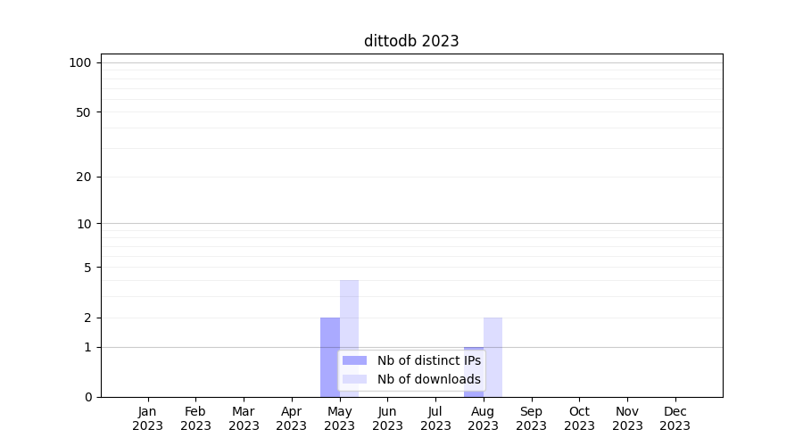 Number of downloads for experiment package dittodb, year by year, from 2025 back to 2014 (years with no downloads are omitted):
