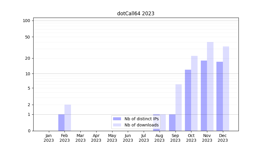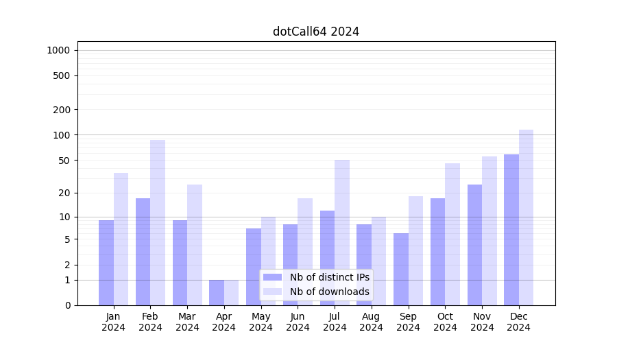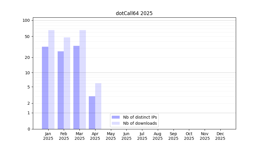 Number of downloads for experiment package dotCall64, year by year, from 2025 back to 2014 (years with no downloads are omitted):