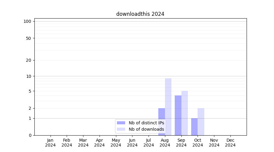 Number of downloads for experiment package downloadthis, year by year, from 2025 back to 2014 (years with no downloads are omitted):