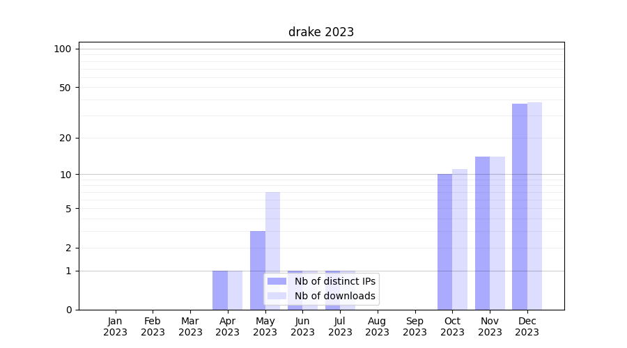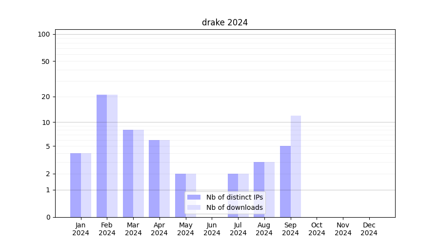Number of downloads for experiment package drake, year by year, from 2025 back to 2014 (years with no downloads are omitted):