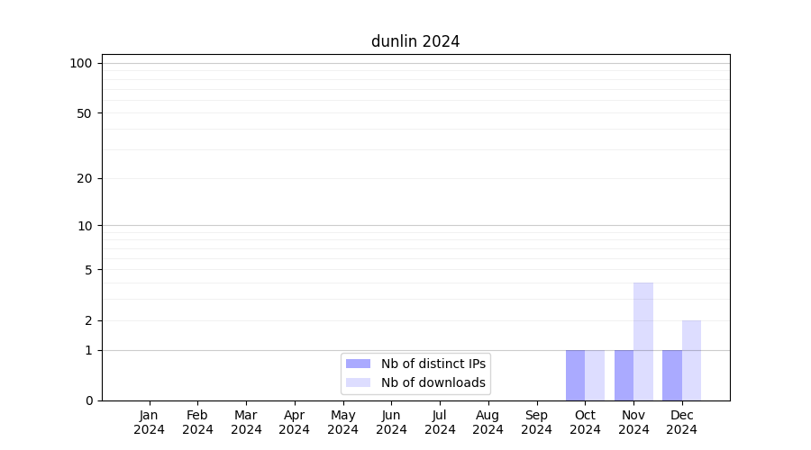 Number of downloads for experiment package dunlin, year by year, from 2025 back to 2014 (years with no downloads are omitted):