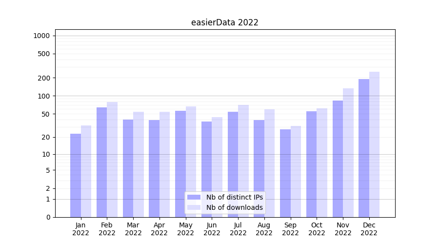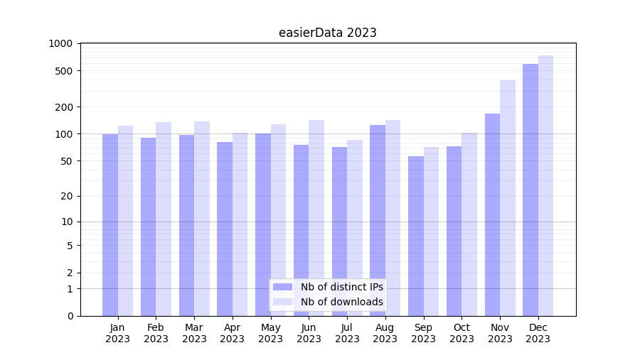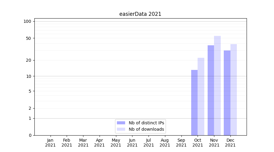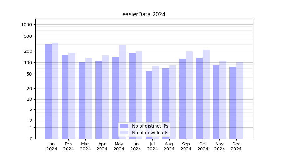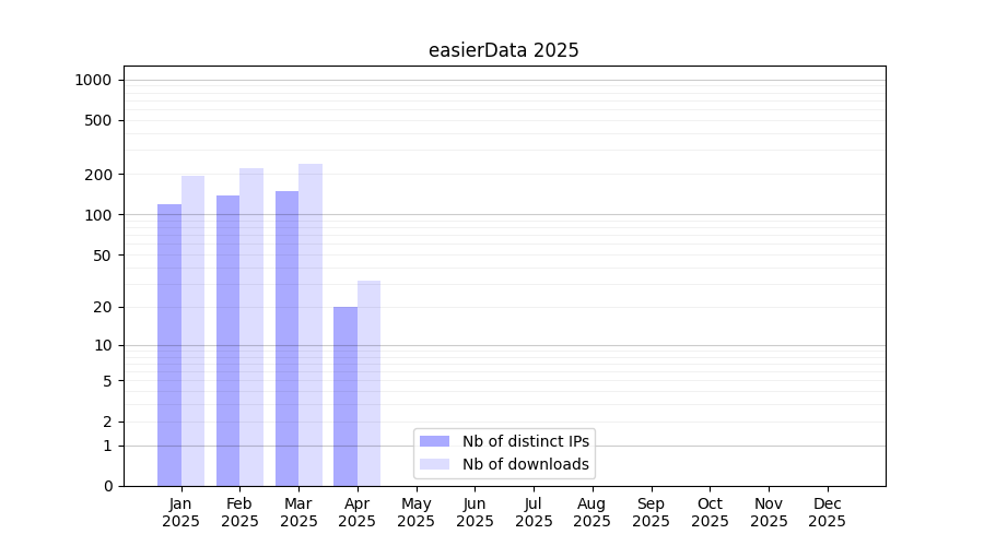 Number of downloads for experiment package easierData, year by year, from 2025 back to 2014 (years with no downloads are omitted):