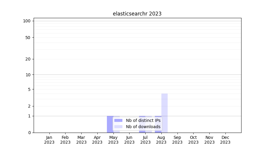 Number of downloads for experiment package elasticsearchr, year by year, from 2025 back to 2014 (years with no downloads are omitted):
