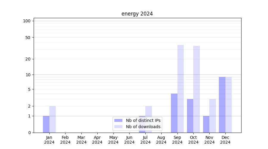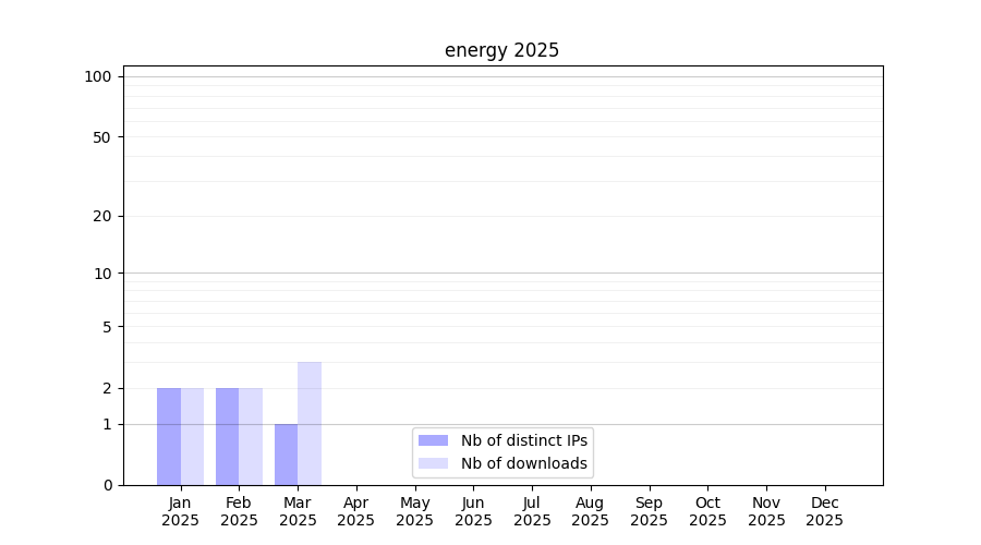 Number of downloads for experiment package energy, year by year, from 2025 back to 2014 (years with no downloads are omitted):