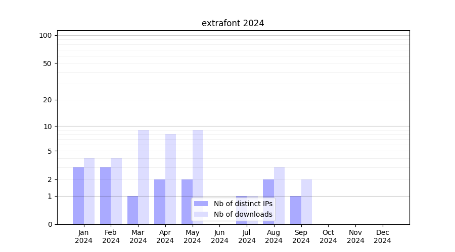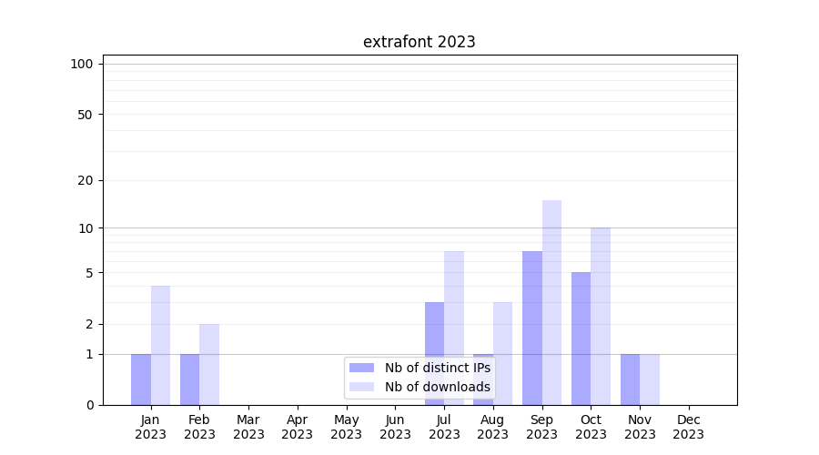 Number of downloads for experiment package extrafont, year by year, from 2025 back to 2014 (years with no downloads are omitted):