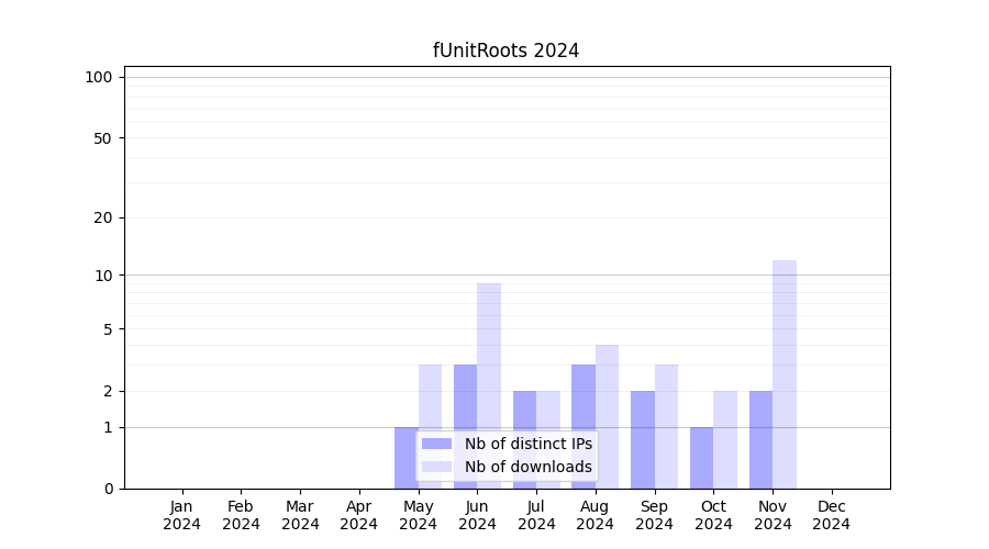 Number of downloads for experiment package fUnitRoots, year by year, from 2025 back to 2014 (years with no downloads are omitted):