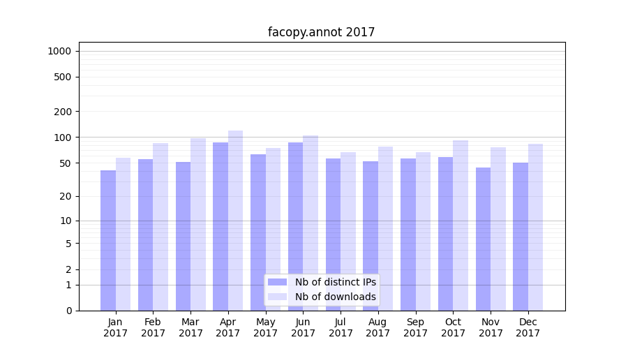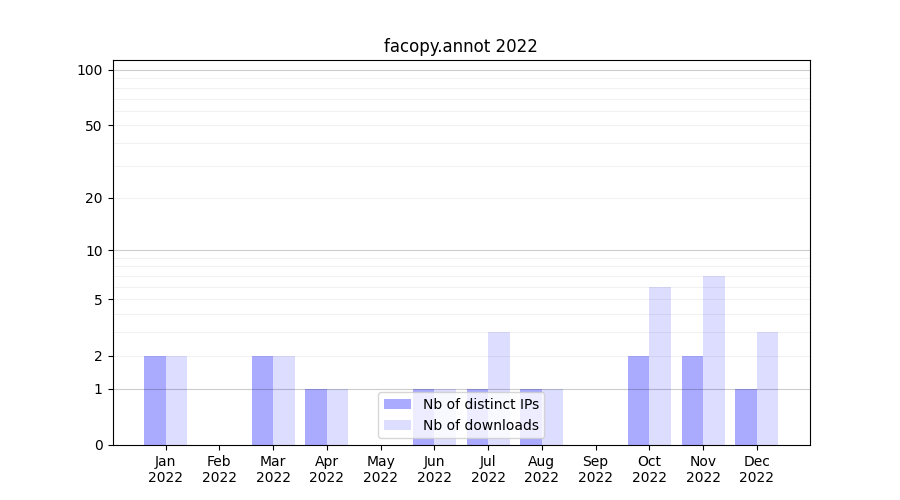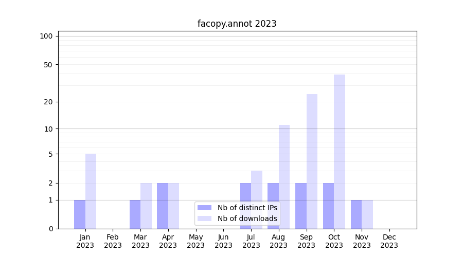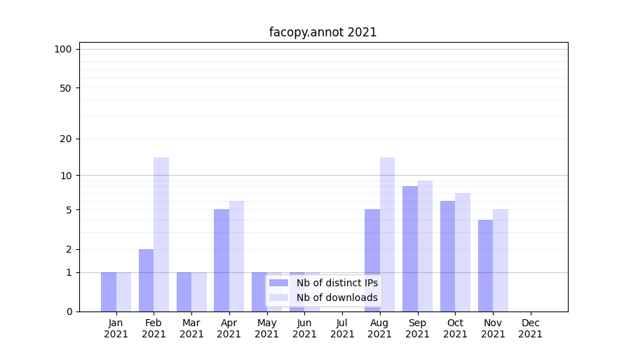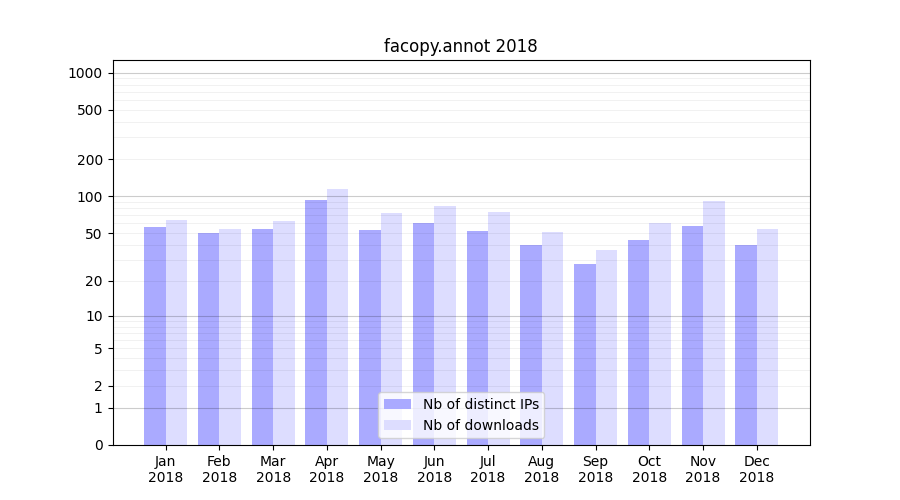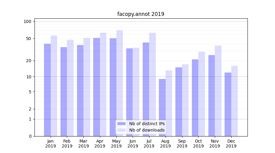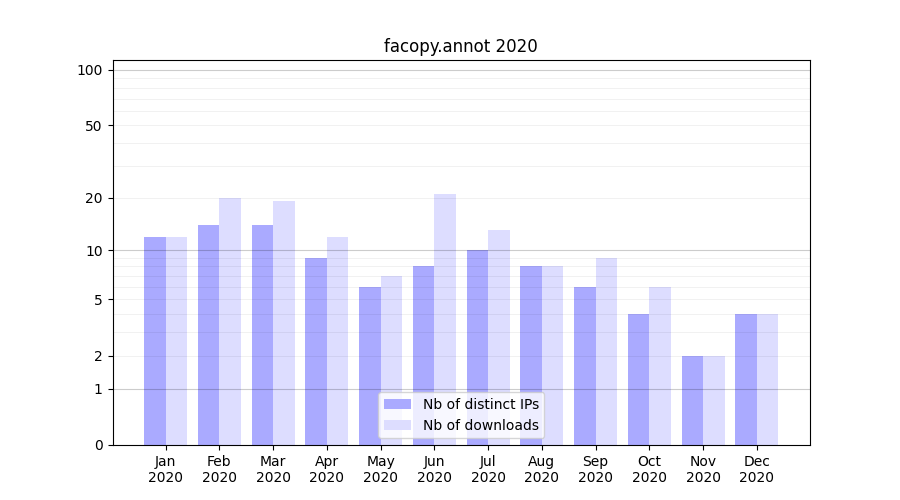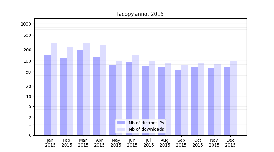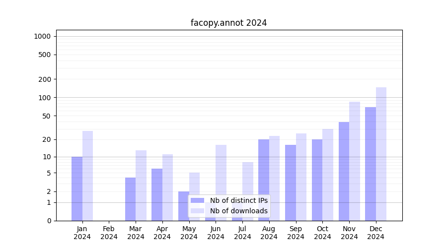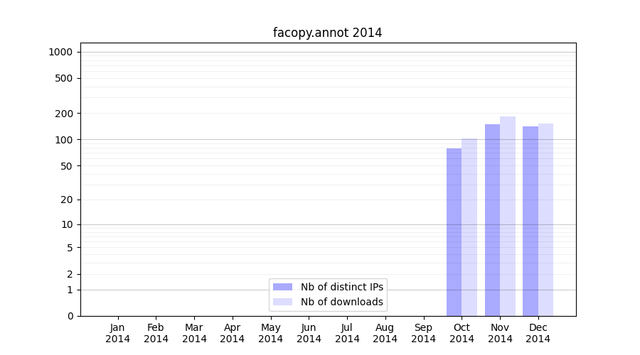 Number of downloads for experiment package facopy.annot, year by year, from 2025 back to 2014 (years with no downloads are omitted):