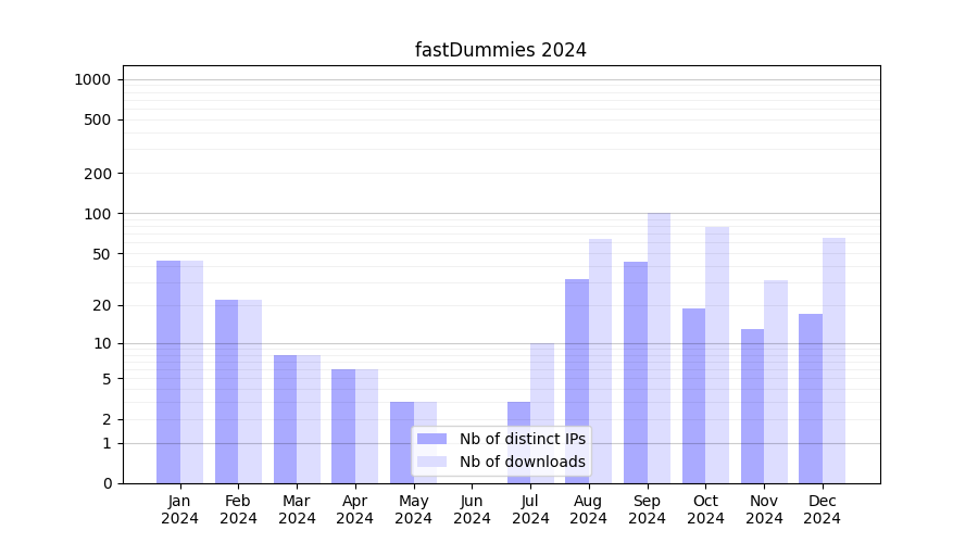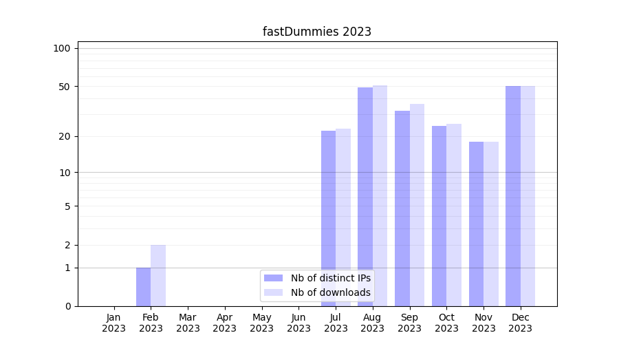 Number of downloads for experiment package fastDummies, year by year, from 2025 back to 2014 (years with no downloads are omitted):