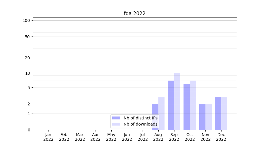 Number of downloads for experiment package fda, year by year, from 2025 back to 2014 (years with no downloads are omitted):