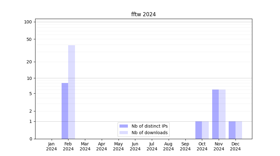 Number of downloads for experiment package fftw, year by year, from 2025 back to 2014 (years with no downloads are omitted):