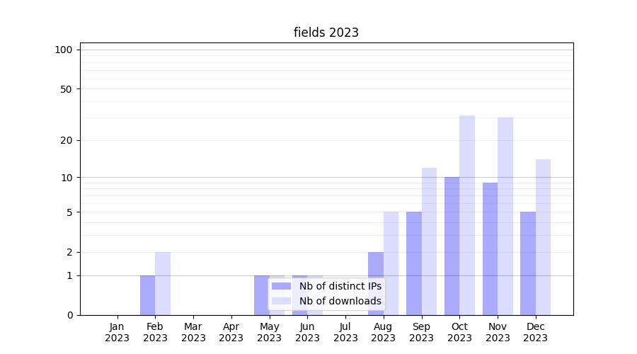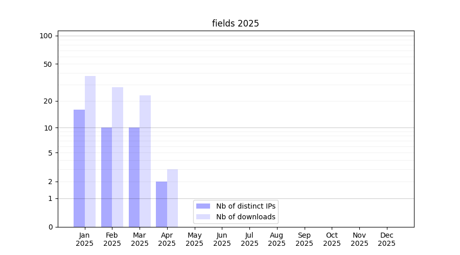 Number of downloads for experiment package fields, year by year, from 2025 back to 2014 (years with no downloads are omitted):