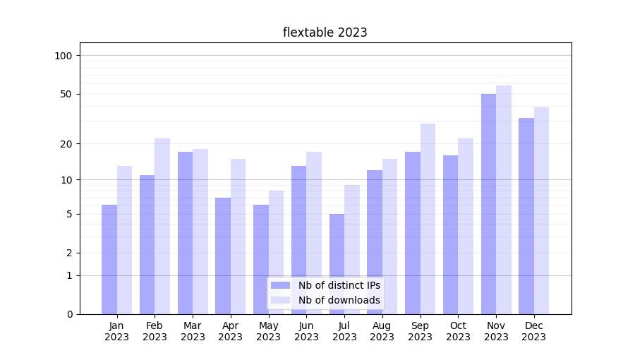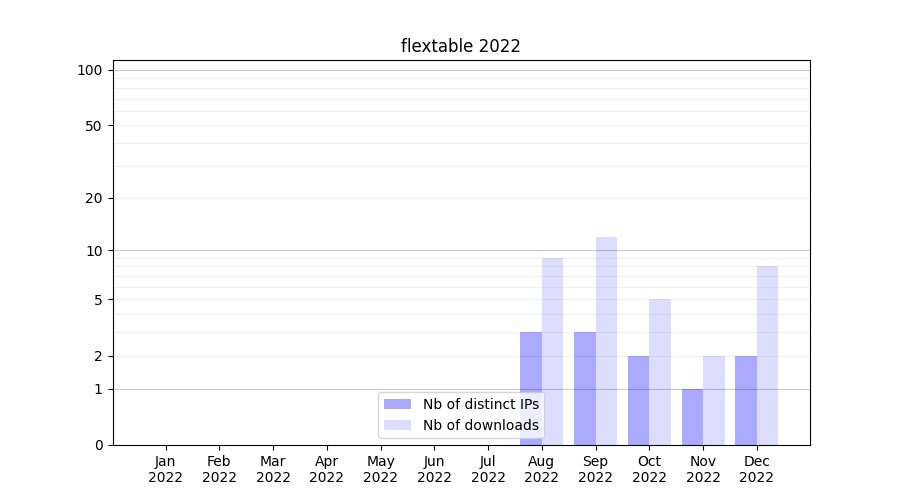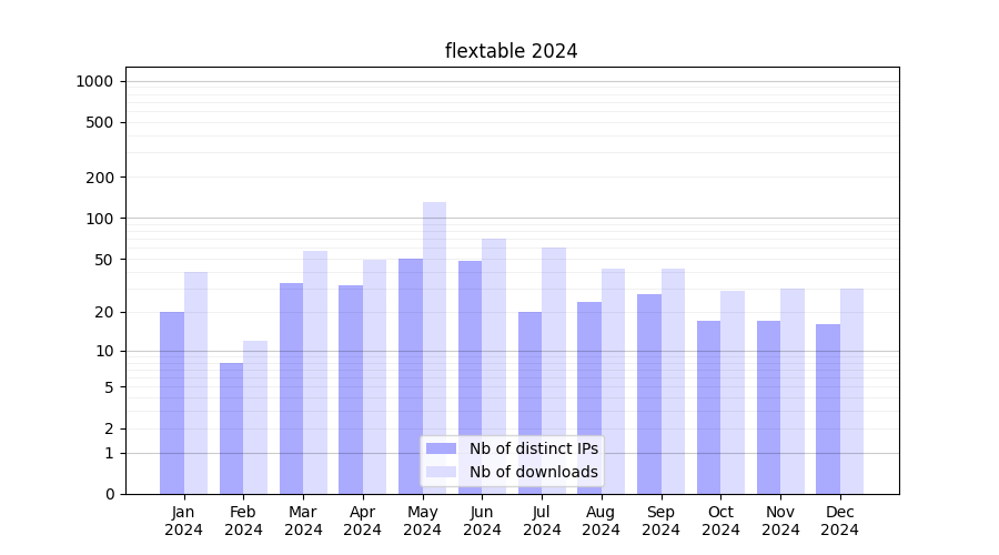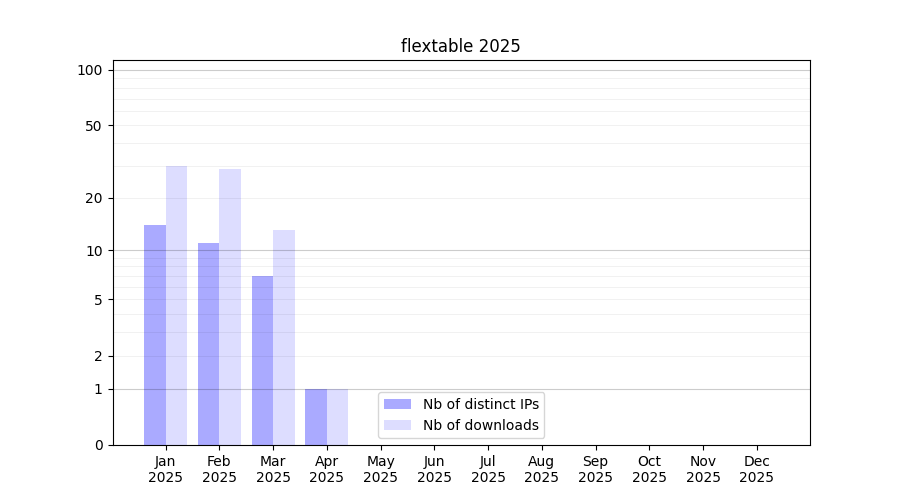 Number of downloads for experiment package flextable, year by year, from 2025 back to 2014 (years with no downloads are omitted):