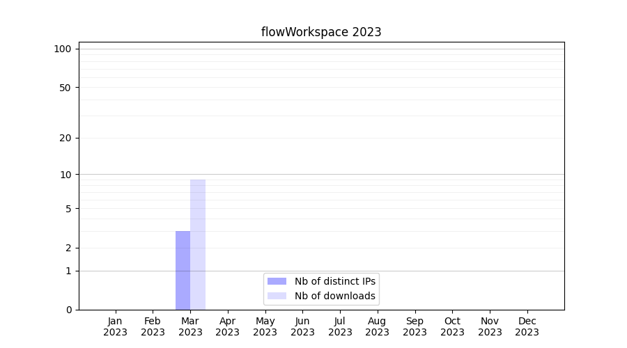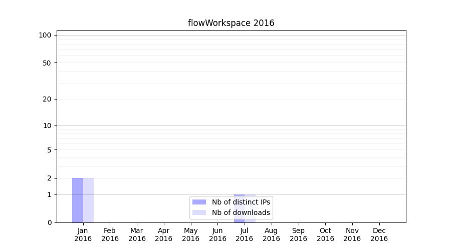 Number of downloads for experiment package flowWorkspace, year by year, from 2025 back to 2014 (years with no downloads are omitted):