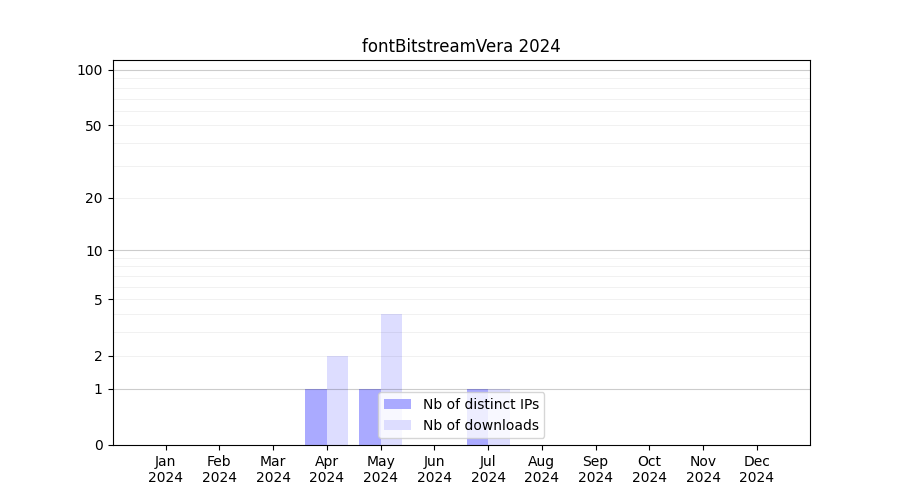 Number of downloads for experiment package fontBitstreamVera, year by year, from 2025 back to 2014 (years with no downloads are omitted):