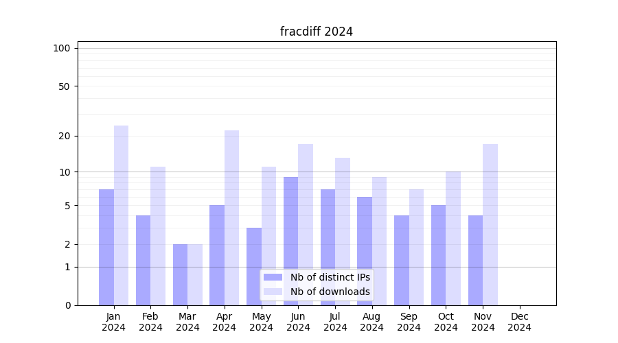 Number of downloads for experiment package fracdiff, year by year, from 2025 back to 2014 (years with no downloads are omitted):