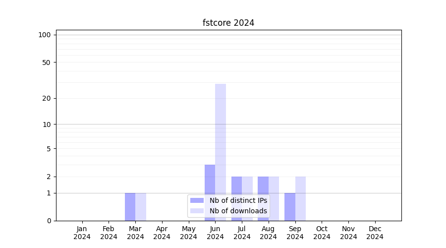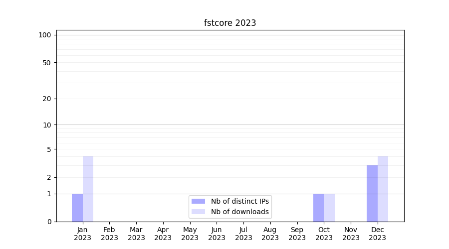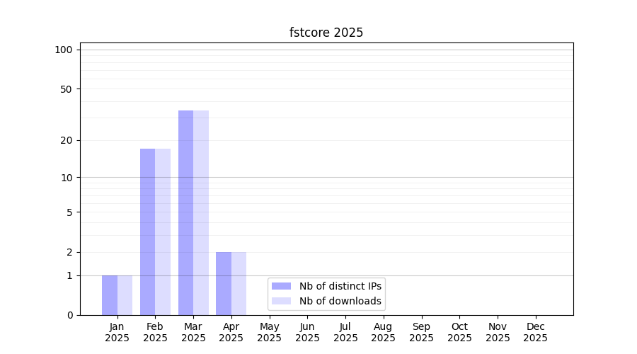 Number of downloads for experiment package fstcore, year by year, from 2025 back to 2014 (years with no downloads are omitted):
