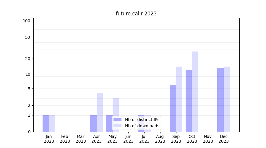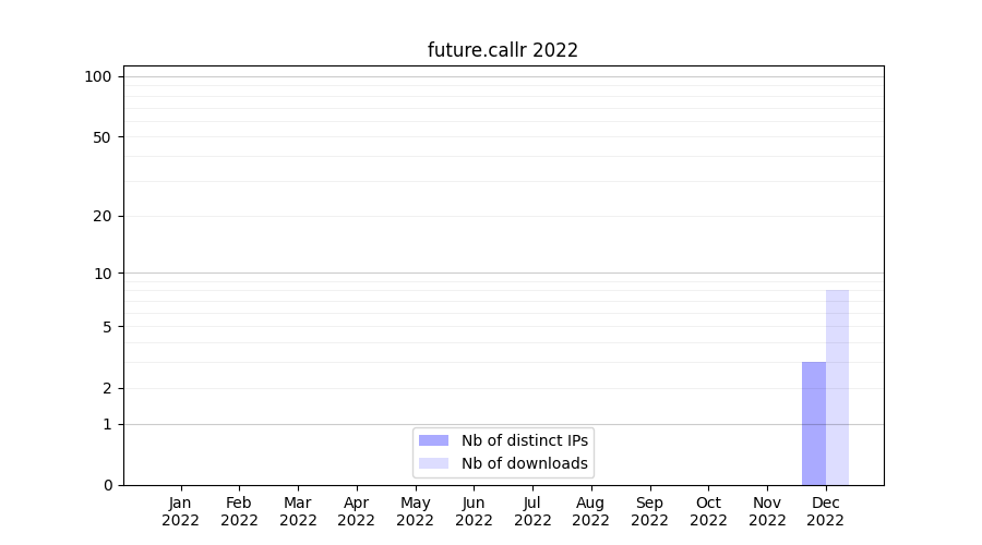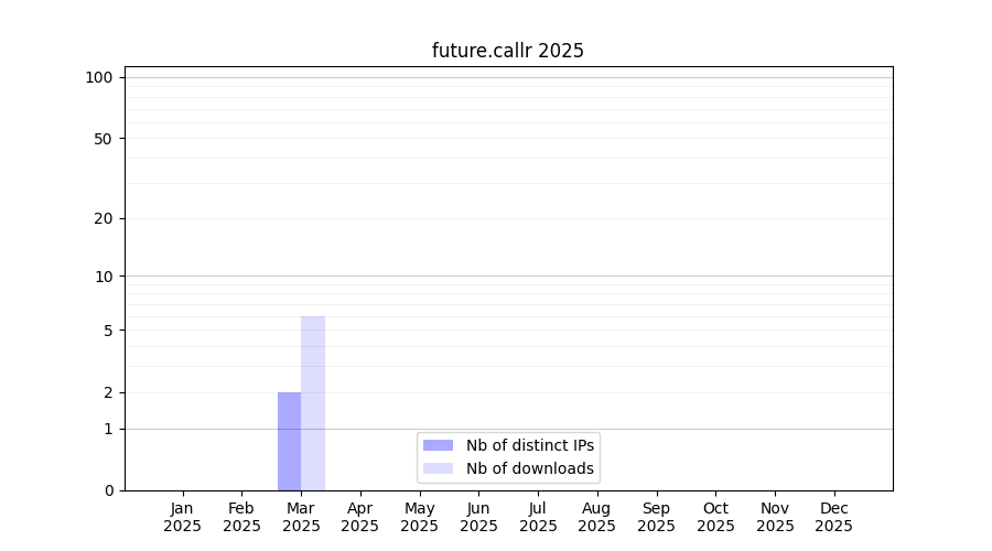 Number of downloads for experiment package future.callr, year by year, from 2025 back to 2014 (years with no downloads are omitted):
