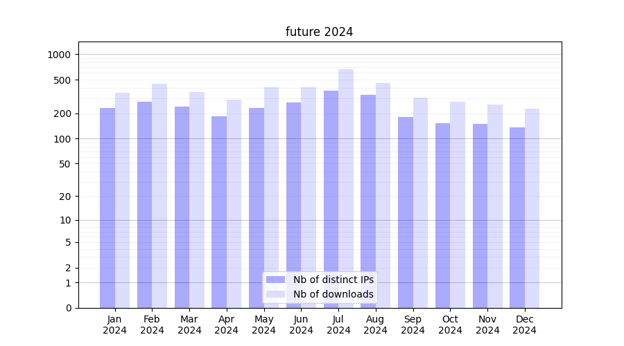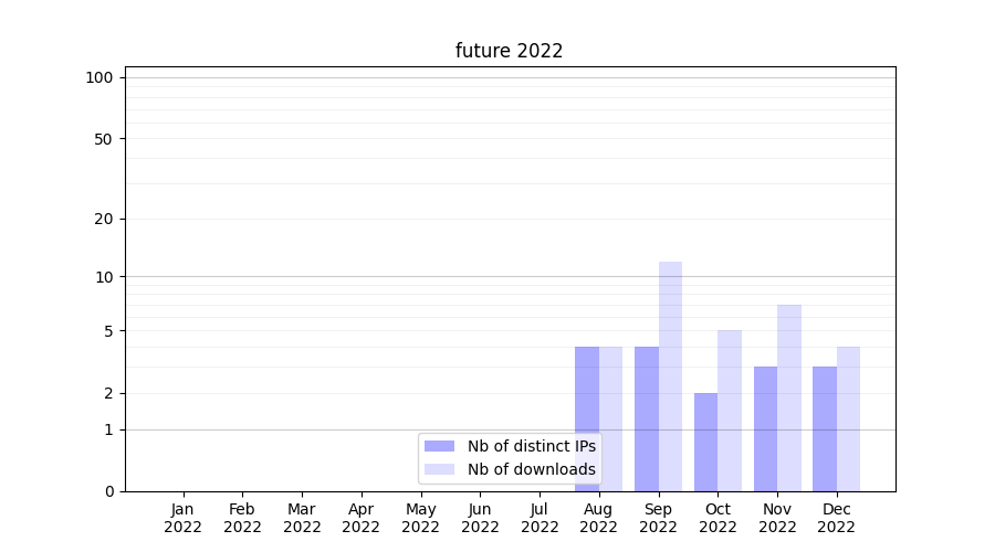Number of downloads for experiment package future, year by year, from 2025 back to 2014 (years with no downloads are omitted):