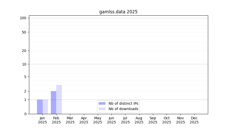 Number of downloads for experiment package gamlss.data, year by year, from 2025 back to 2014 (years with no downloads are omitted):