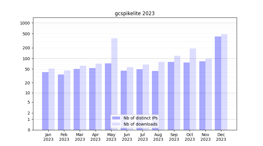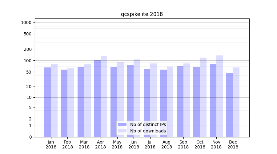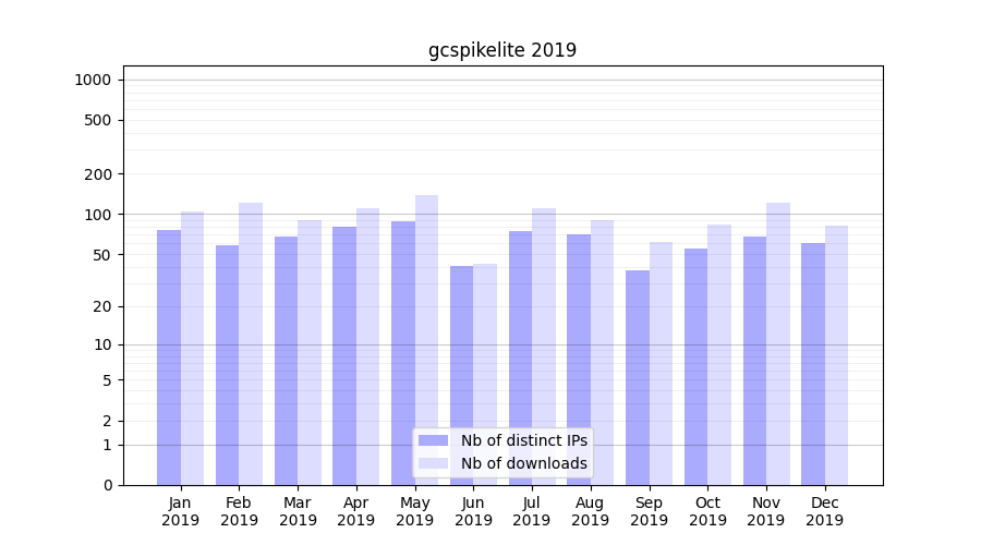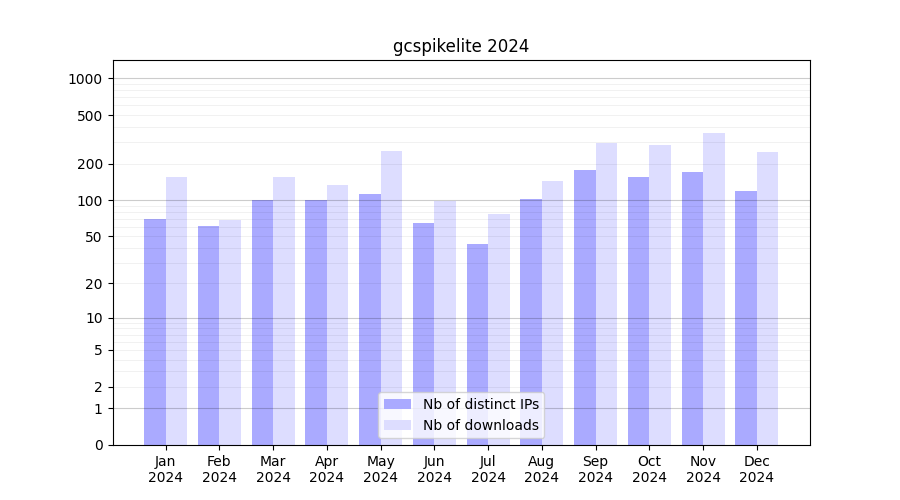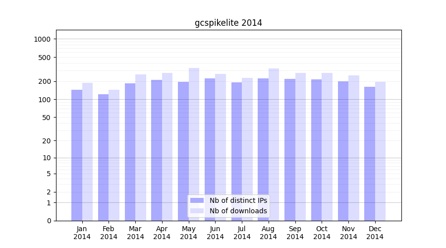 Number of downloads for experiment package gcspikelite, year by year, from 2025 back to 2014 (years with no downloads are omitted):