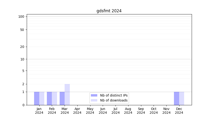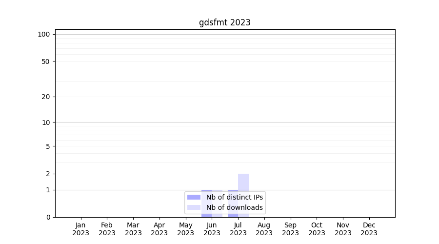 Number of downloads for experiment package gdsfmt, year by year, from 2025 back to 2014 (years with no downloads are omitted):