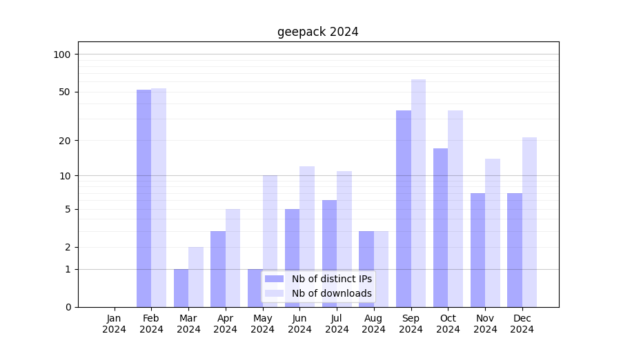 Number of downloads for experiment package geepack, year by year, from 2025 back to 2014 (years with no downloads are omitted):