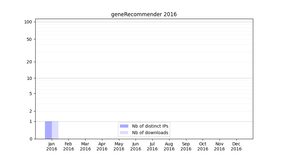 Number of downloads for experiment package geneRecommender, year by year, from 2025 back to 2014 (years with no downloads are omitted):