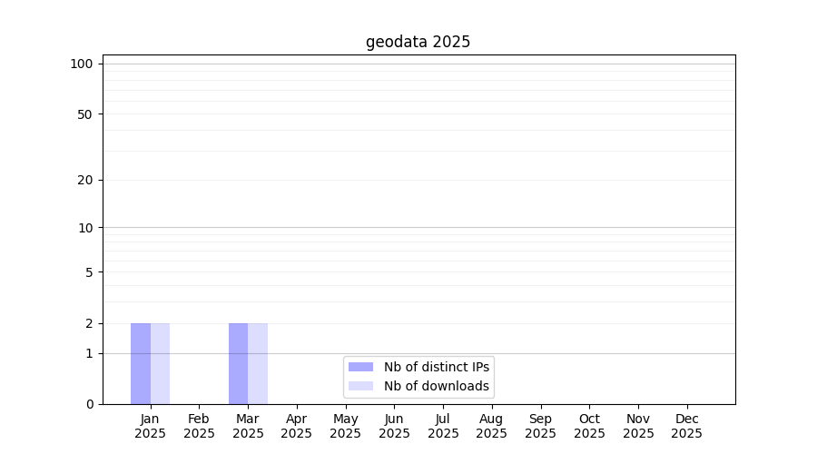 Number of downloads for experiment package geodata, year by year, from 2025 back to 2014 (years with no downloads are omitted):