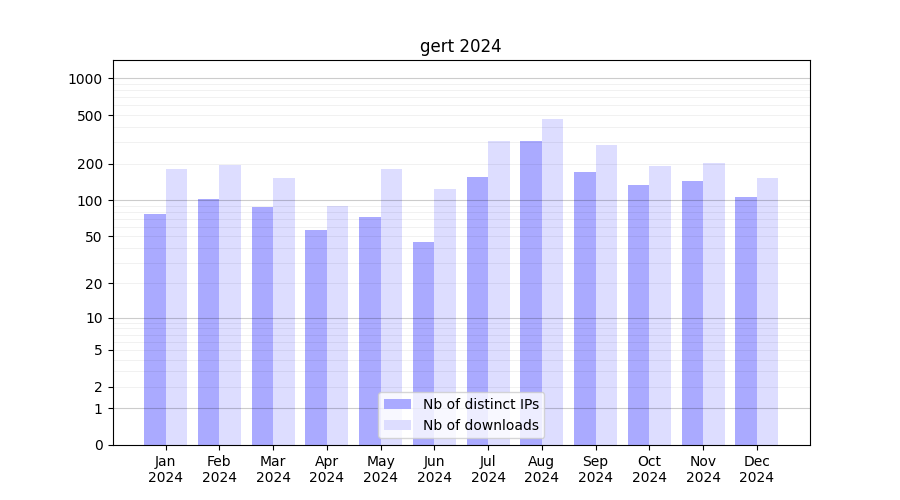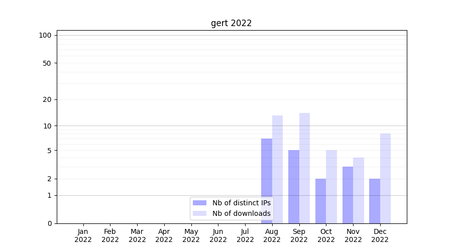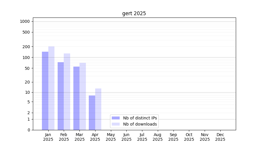 Number of downloads for experiment package gert, year by year, from 2025 back to 2014 (years with no downloads are omitted):