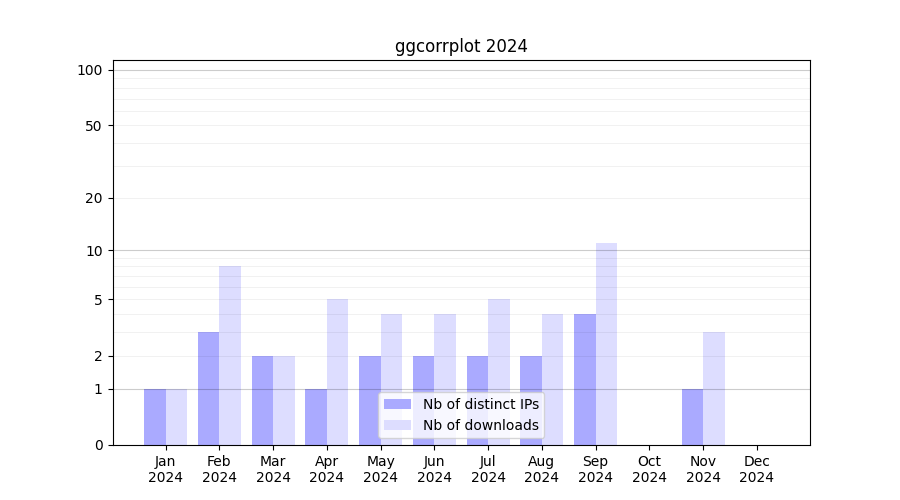 Number of downloads for experiment package ggcorrplot, year by year, from 2025 back to 2014 (years with no downloads are omitted):