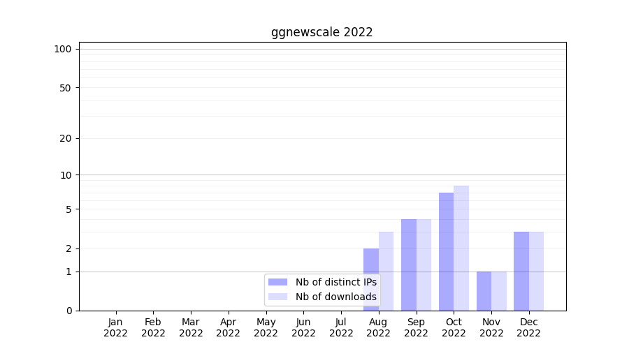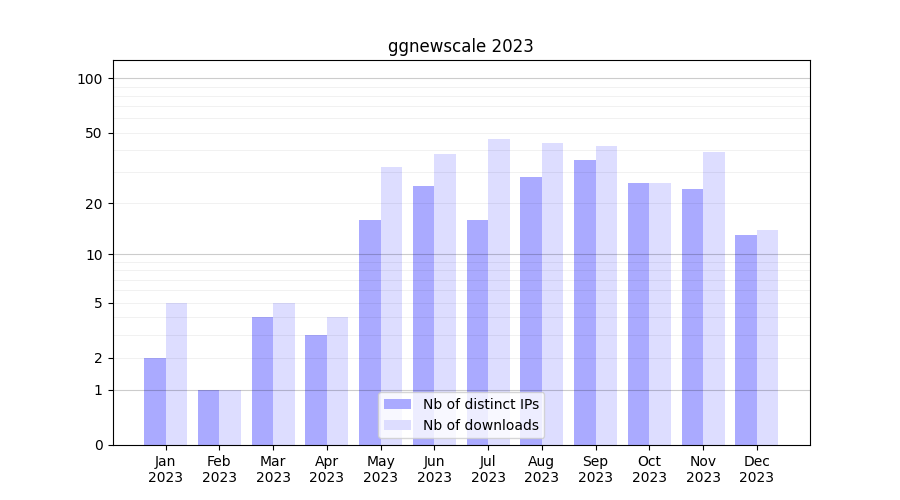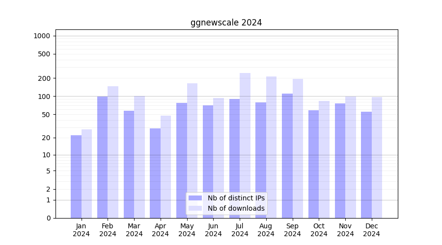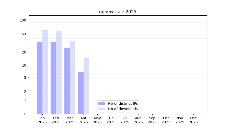 Number of downloads for experiment package ggnewscale, year by year, from 2025 back to 2014 (years with no downloads are omitted):