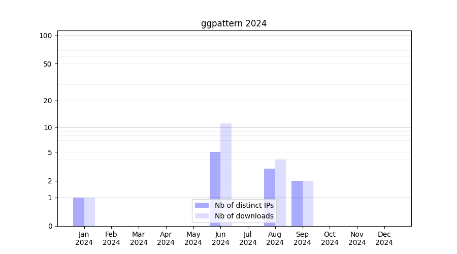 Number of downloads for experiment package ggpattern, year by year, from 2025 back to 2014 (years with no downloads are omitted):