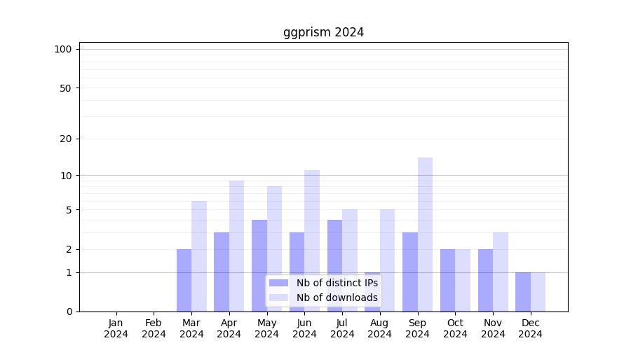 Number of downloads for experiment package ggprism, year by year, from 2025 back to 2014 (years with no downloads are omitted):
