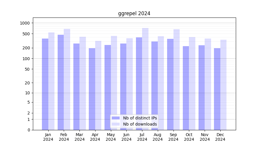 Number of downloads for experiment package ggrepel, year by year, from 2025 back to 2014 (years with no downloads are omitted):