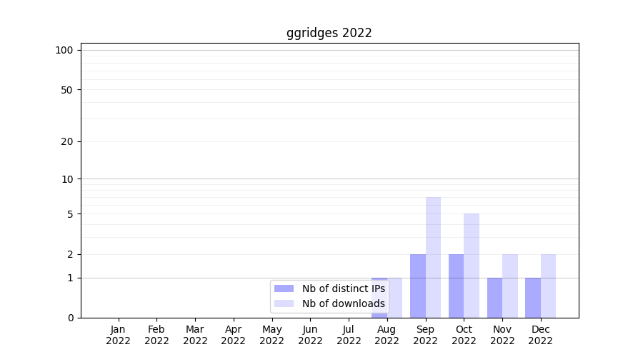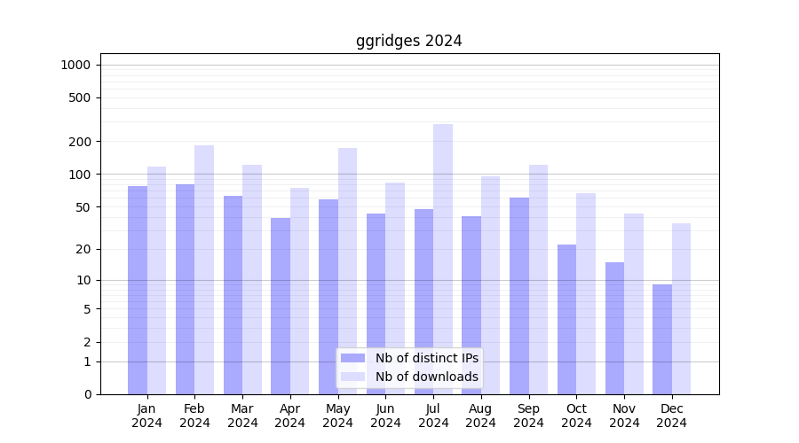 Number of downloads for experiment package ggridges, year by year, from 2025 back to 2014 (years with no downloads are omitted):