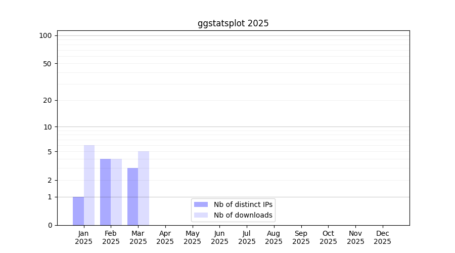 Number of downloads for experiment package ggstatsplot, year by year, from 2025 back to 2014 (years with no downloads are omitted):