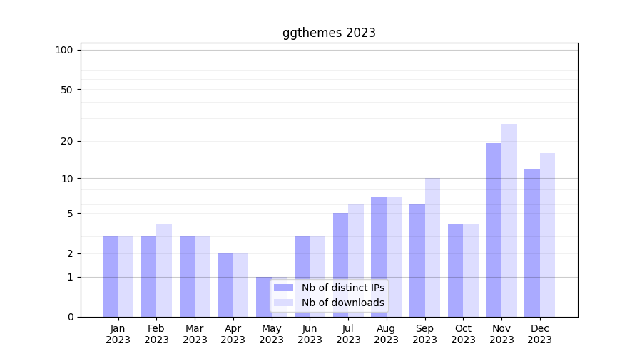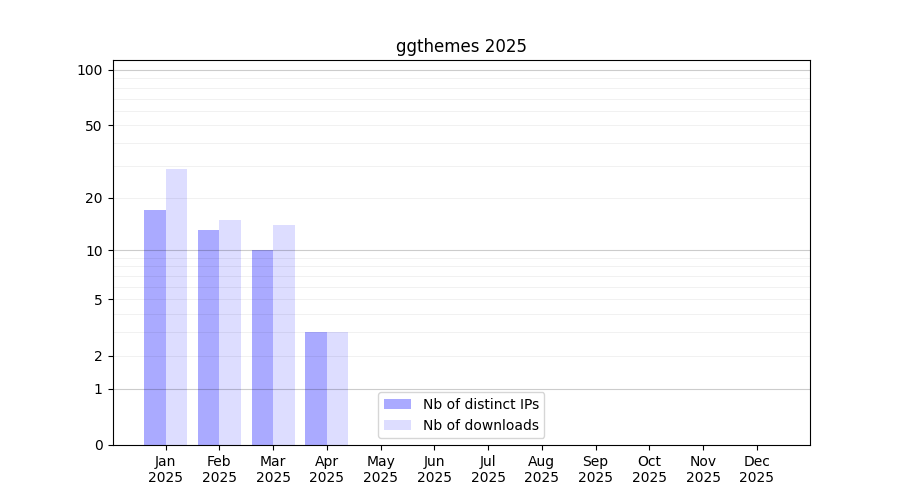 Number of downloads for experiment package ggthemes, year by year, from 2025 back to 2014 (years with no downloads are omitted):