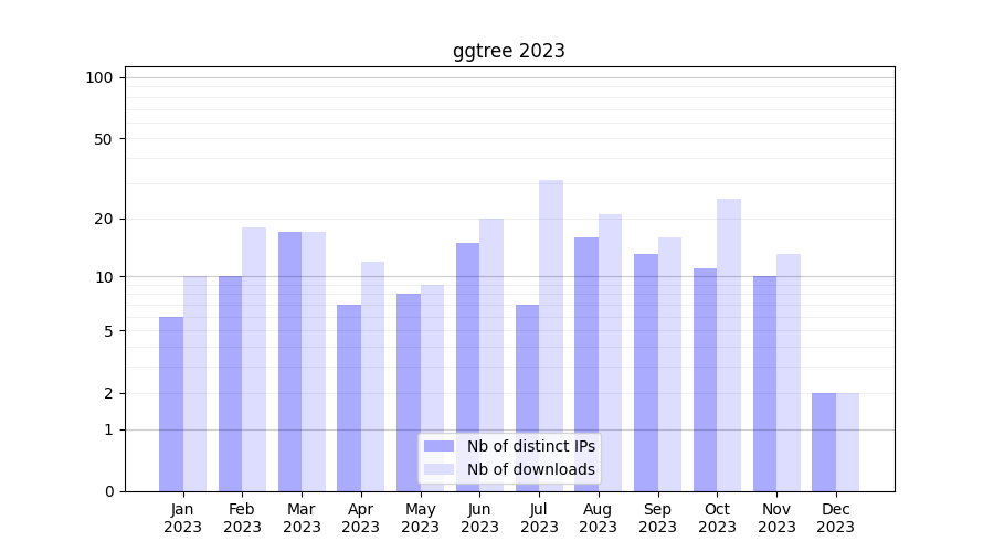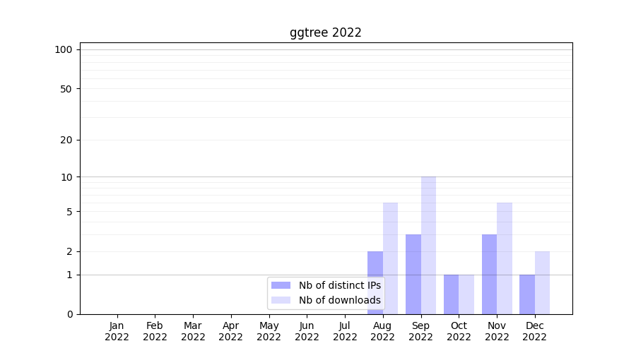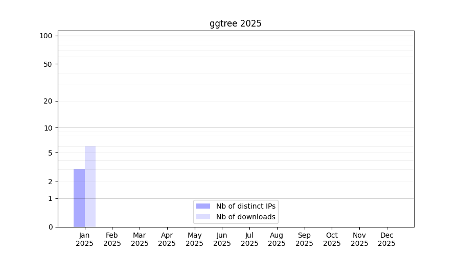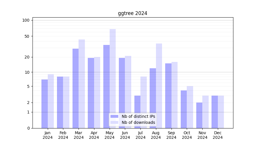 Number of downloads for experiment package ggtree, year by year, from 2025 back to 2014 (years with no downloads are omitted):