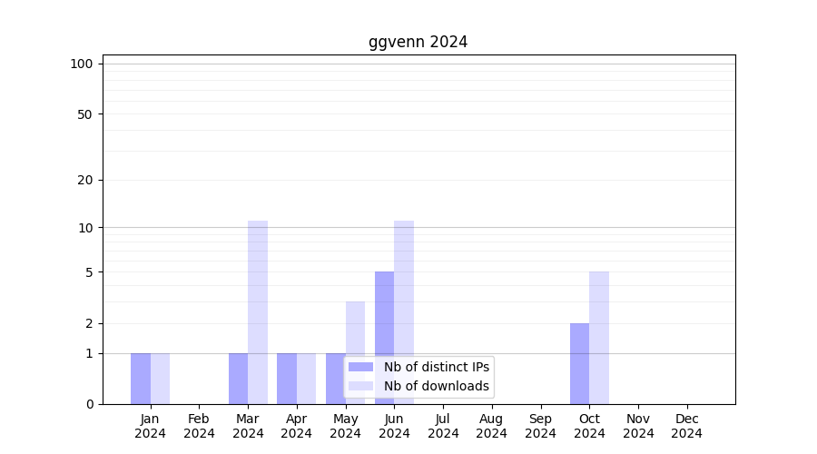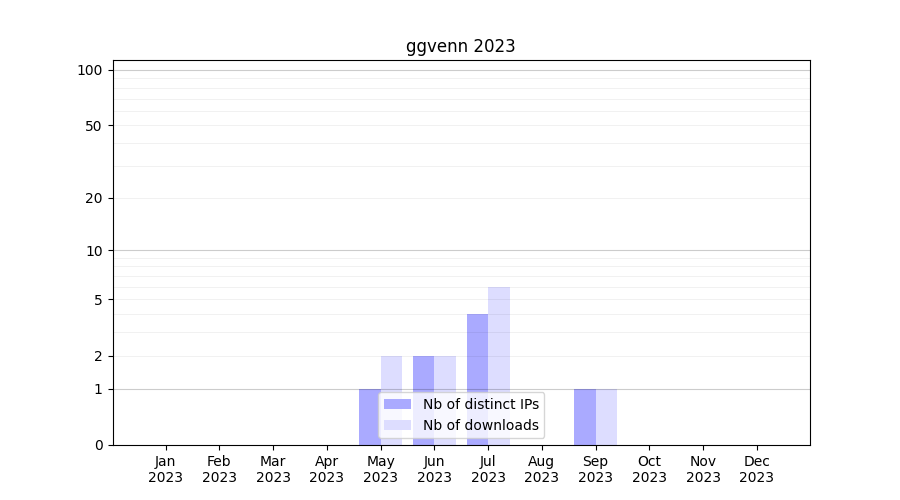 Number of downloads for experiment package ggvenn, year by year, from 2025 back to 2014 (years with no downloads are omitted):