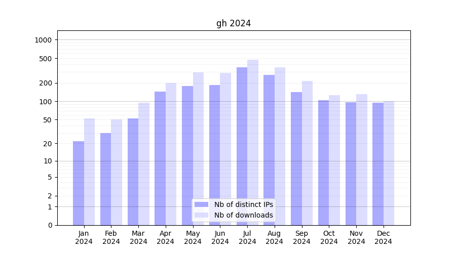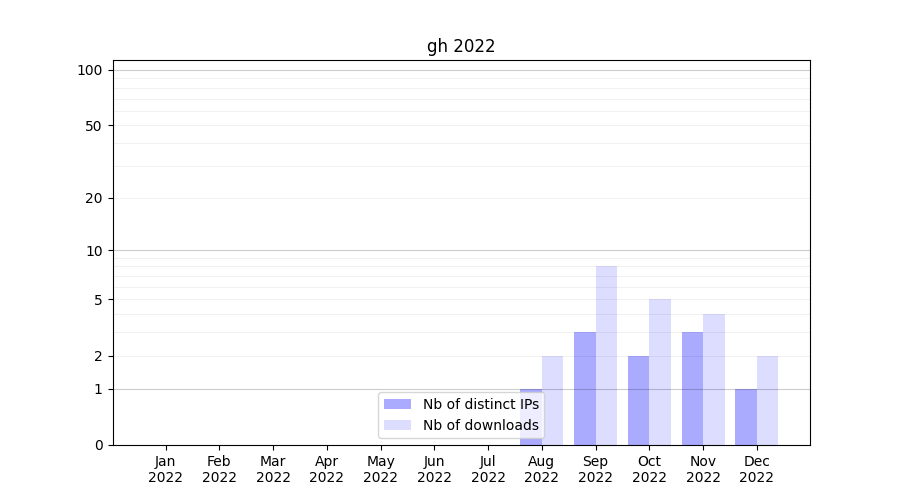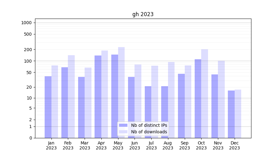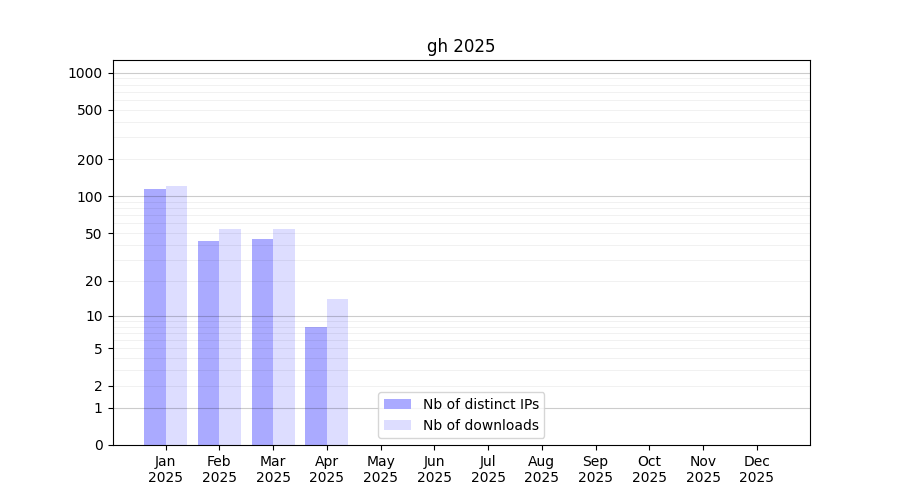 Number of downloads for experiment package gh, year by year, from 2025 back to 2014 (years with no downloads are omitted):