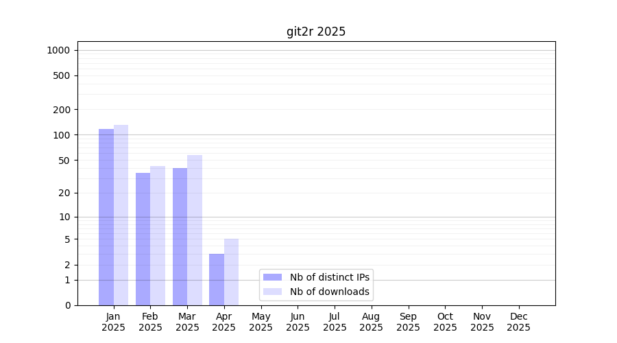 Number of downloads for experiment package git2r, year by year, from 2025 back to 2014 (years with no downloads are omitted):