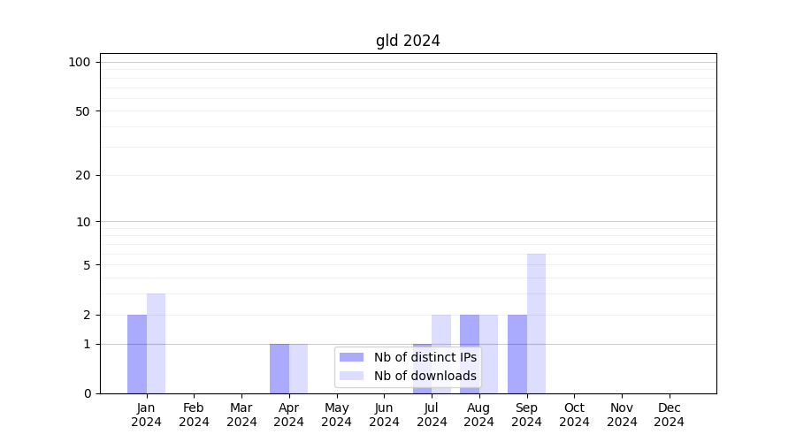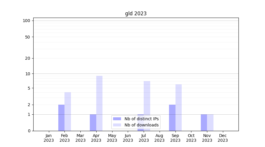 Number of downloads for experiment package gld, year by year, from 2025 back to 2014 (years with no downloads are omitted):