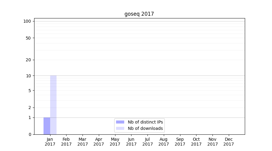 Number of downloads for experiment package goseq, year by year, from 2025 back to 2014 (years with no downloads are omitted):