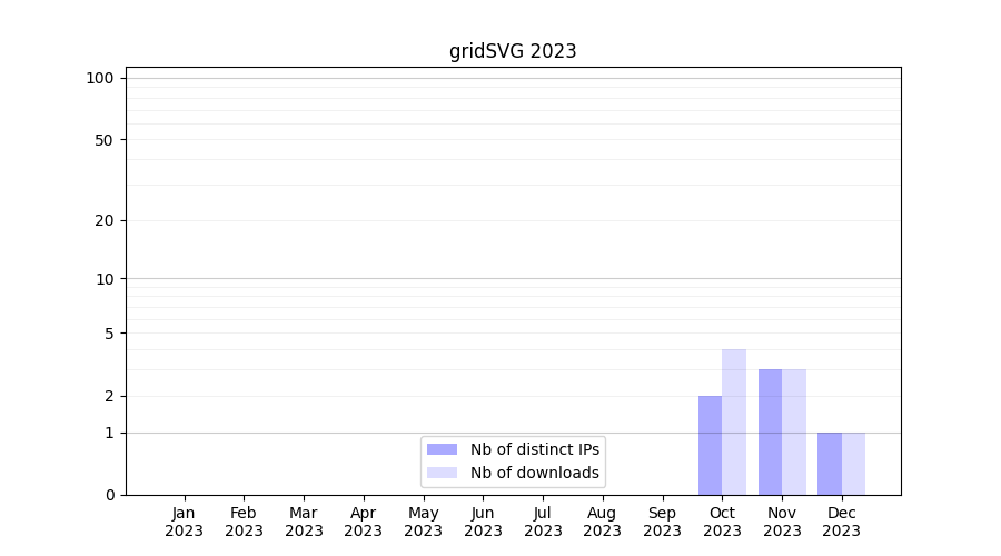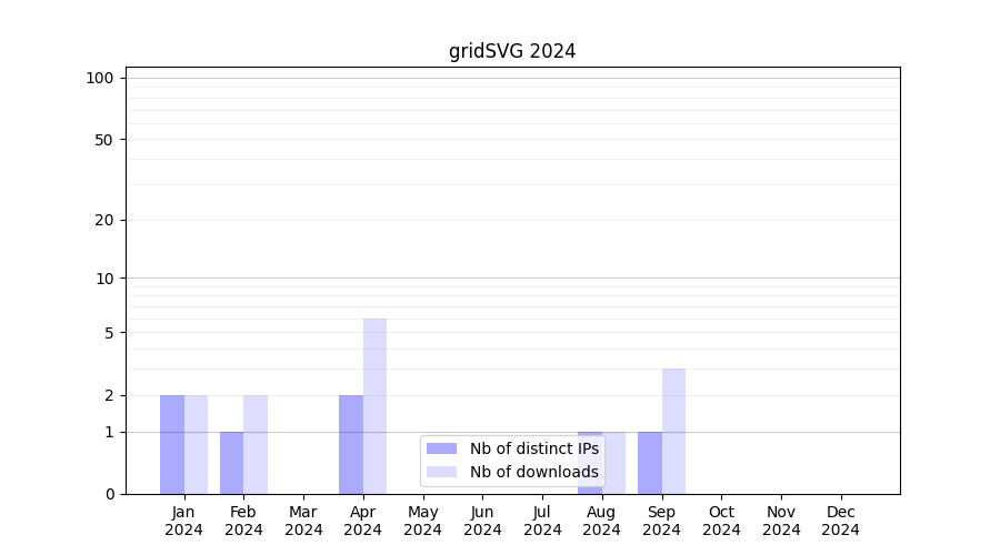 Number of downloads for experiment package gridSVG, year by year, from 2025 back to 2014 (years with no downloads are omitted):