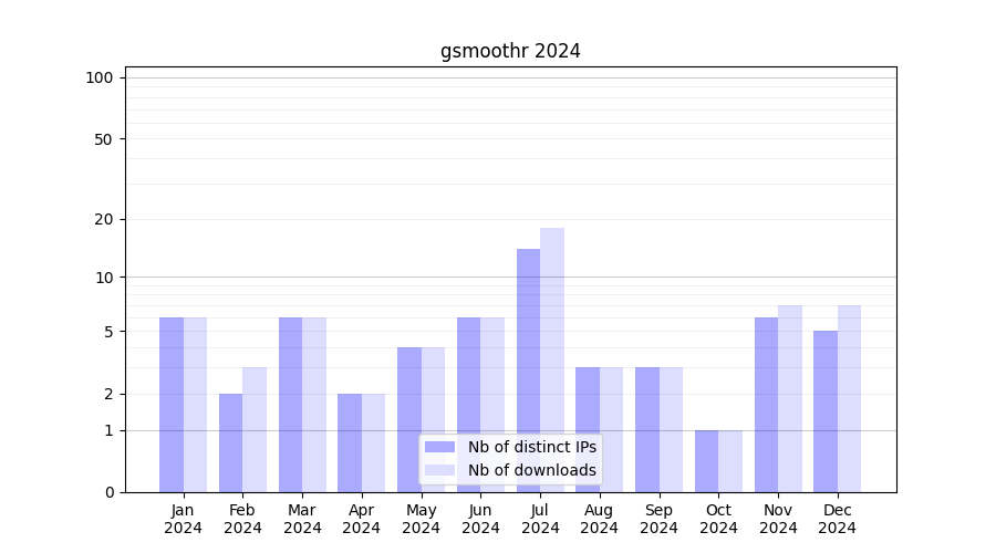 Number of downloads for experiment package gsmoothr, year by year, from 2025 back to 2014 (years with no downloads are omitted):
